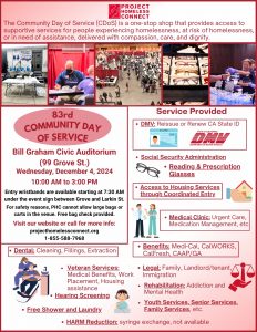 Project Homeless Connect provides services in person at our offices, through mobile off-site services, and virtually on the phone and over email. To see our most up to date service location and calendar, please visit our Services Calendar HERE.