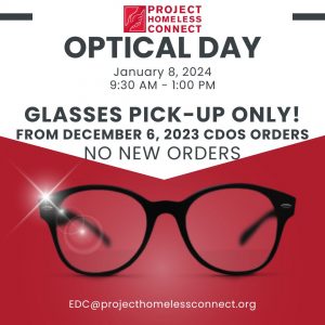 Project Homeless Connect hosts monthly Optical Days to distribute free prescription glasses and glasses fitting services to eligible Medi-Cal recipients.